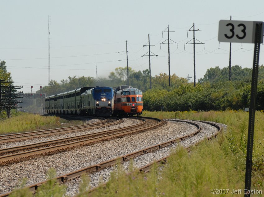 Old meets new at Rondout. The Empire builder passes the CP 2816 excursion train, with the Milwaukee Road Cedar Rapids bringing up the rear.