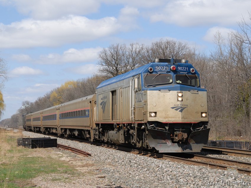 Cabbage 90221 in phase 5 paint hustles an Eastbound Hiawatha through Lake Forest.