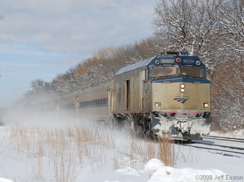 Hiawatha train 334 is kicking up the fresh snow through Lake Forest.