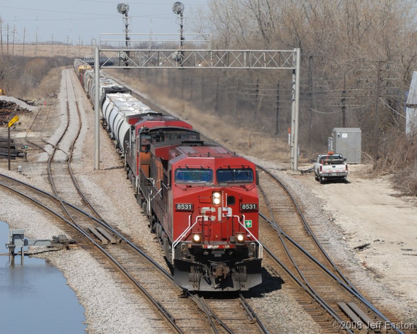 Train 484 is often used as a mule train to carry Bensenville power back and forth to St. Paul for servicing. Todays train has a SOO Bandit switcher second unit out.