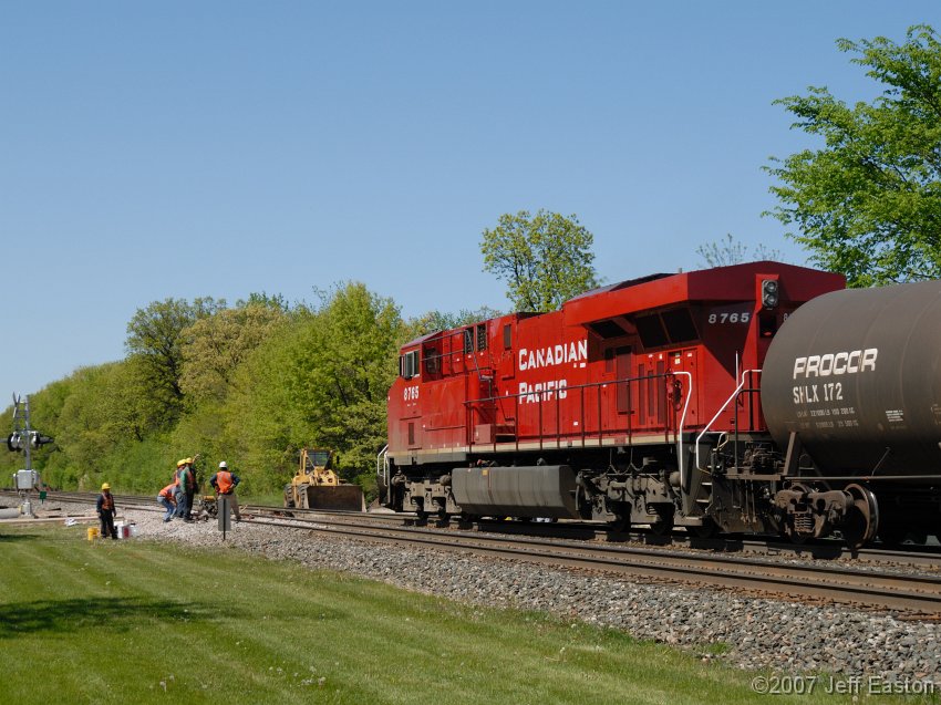 Westbound molten sulfur train slows for the track gang working on the Conway Road crossing replacment.