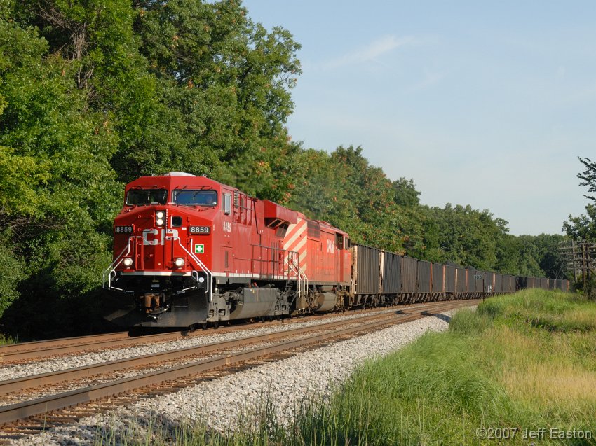 This unit coal train is lead by one of the new CP Olympic units. Two GE's were released to CP without the Canadian Pacific block lettering on the long hood. They were pressed into service for a few months before the CP shops applied the Olympic paint scheme.