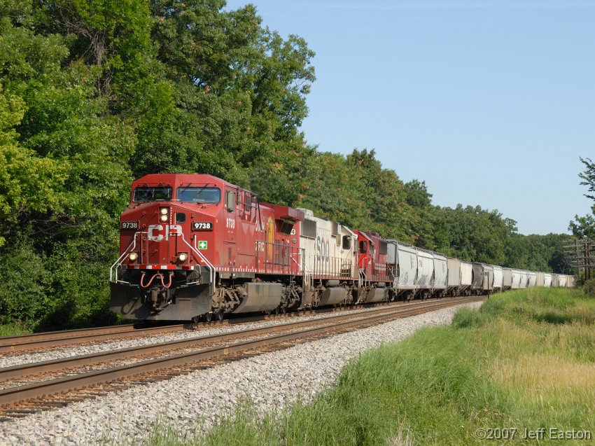 A unit grain train pulls out of Rondout with a couple of SOO SD60's helping out.