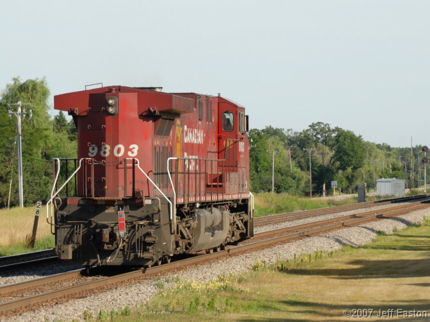 This gives a new meaning to the term "one unit wonder". CP 9803 rolls along eastbound through Lake Forest complete with FRED hanging on the rear.