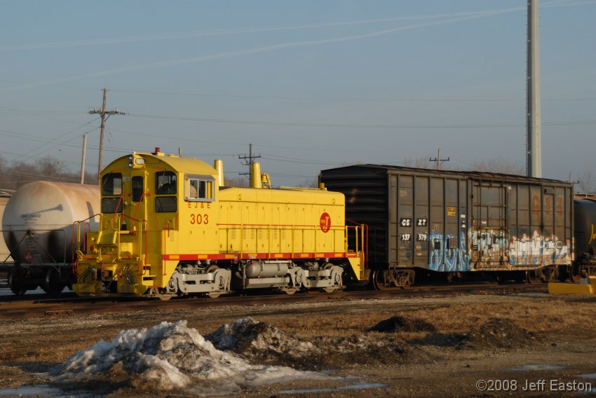 EJ&E 303 shuffles some cars in the west yard, making up its train for Rondout.