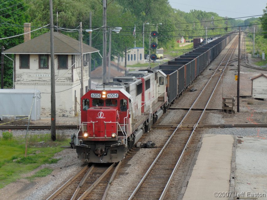 Westbound empty coke train rolls by the tower with two former SOO SD60's that used to call these rails home.