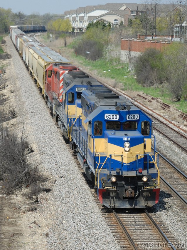 An ICE MHUCC detour train coasts through Deerfield on its way to Clearing Yard. The lead unit developed a hot bearing in Portage, Wi. and was setout, allowing this clean unit to lead.