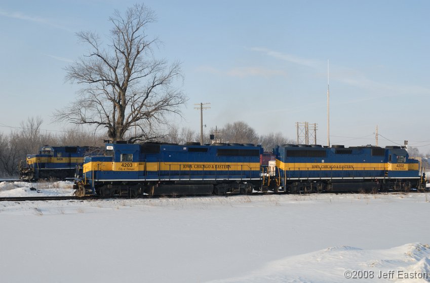 Local power 4203 and 4202 wait patiently on the wye as road train MNACC finishes switching at Davis Junction.