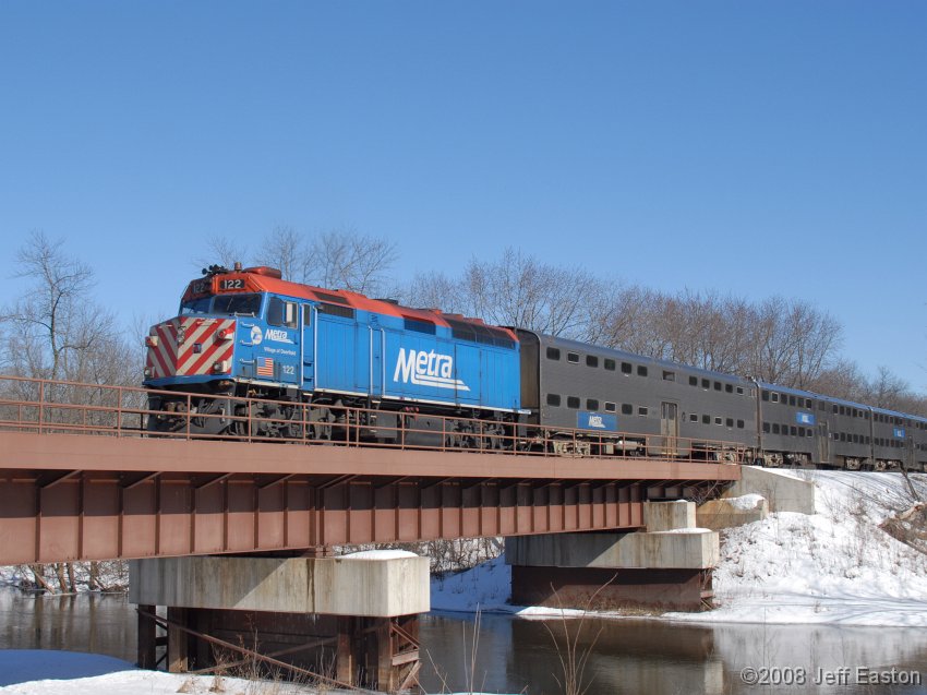 The F40PH "Village of Deerfield" shoves its train across the Des Plains River. In 14 minutes train 2136 will arrive in its namesake village.