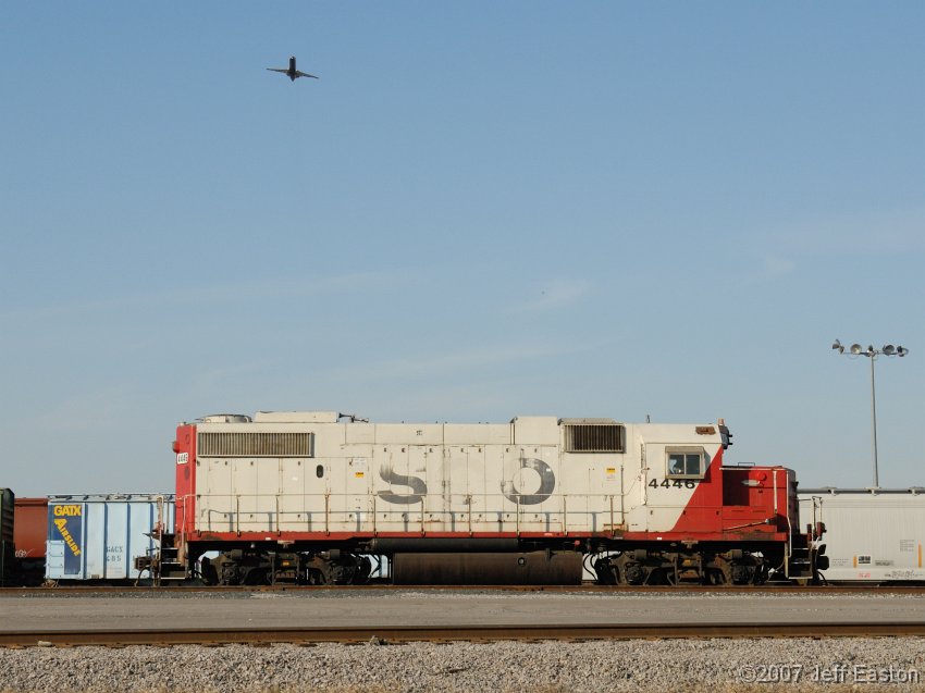 Bensenville yard switcher 4446 takes a break as jets take off from O'hare runway 22L.