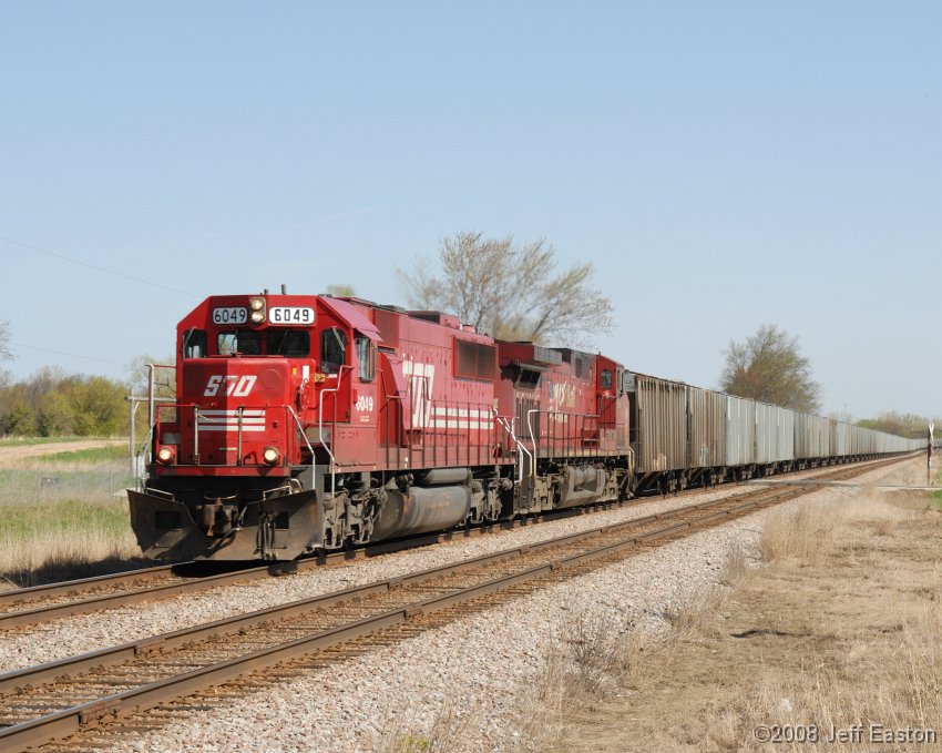 A SOO SD60 leads this Eastbound train of solid ADM grain hoppers out of Pleasant Prairie and across the state line into Illinois.