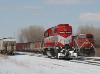 A Westbound trackage rights empty grain train only made it to Rondout today. The train has been put in the East siding and cut for the Atkinson Rd. crossing and the solo power is running to the rear, shown here passing a CP train thats been parked on the West siding for two days. |