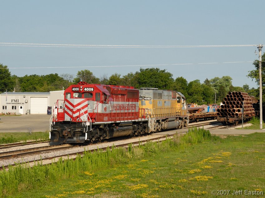 Switching out the pipe loads at Frank Management for the Enbridge pipeline project. The pipes were transloaded to trucks on the south siding.